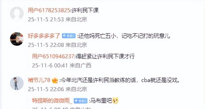 许利民在联赛犯的错误依然没有得到改正,在联赛也是先赢后输,胡乱换人,遭逆转屡屡出现,赛后言论更是奇葩,输了却说是赢了,还有计划内输球等谬论,为自己的无能找各种借口。球迷也是怒了,他们批评“又是熟悉的味道,哪个状态好就是换下去”、“明知道天津没内线,就时德帅一个,给他强度啊!”球迷认为北京队最大的短板应该是教练,并呼吁“得赶紧让许利民下课才行”、“今年北汽还是许利民当教练的话,cba就还是没戏”。诸位,你对许利民的糟糕指挥,有何评论?