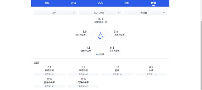 23-24赛季,阿不都沙拉木场均还能交出两双的成绩单,砍下19分10.2篮板,但24-25赛季,他的表现就降至9.9分6.2篮板,本赛季4次出场后,场均数据更是进一步下滑到6.8分3.3篮板。