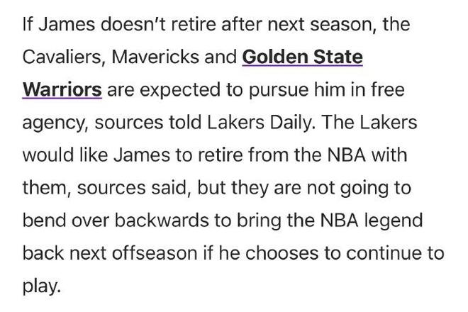 消息人士告诉《Lakers Daily》,如果詹姆斯在下个赛季后不退役,他存在不小离开湖人的可能性。届时骑士、独行侠和勇士有望在自由市场追求詹姆斯。消息人士称,湖人希望詹姆斯在紫金军团退役,但如果詹姆斯继续打球,他们也不会全力挽留詹姆斯,毕竟湖人已经进入东契奇时代。