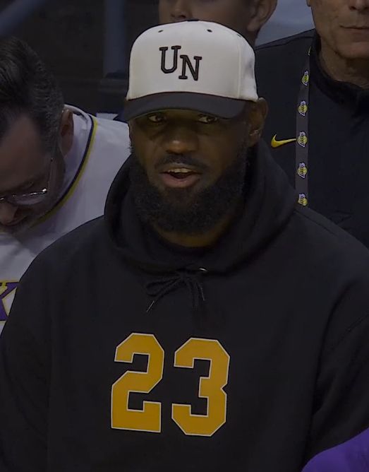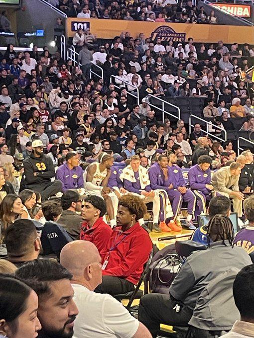 雷速体育10月13日讯 NBA季前赛继续进行,湖人今天在主场迎战勇士,勒布朗因为坐骨神经痛缺席本场比赛。湖人记者Mark Medina晒出现场照,勒布朗坐在一张更高的椅子上,紧挨着他的队