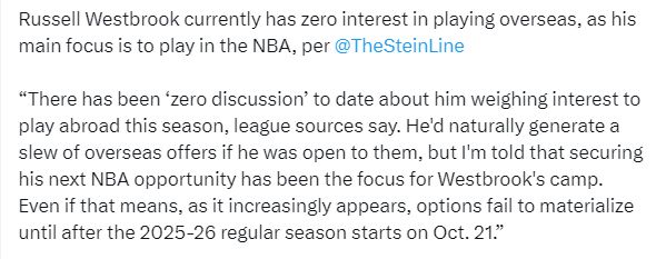 Marc Stein报道,消息人士透露,目前威少本赛季没有考虑去海外打球,如果他愿意的话,自然会收到大量海外合同报价。但我听说,确保下一个NBA机会一直是威少团队的重点,即使这意味着(情况似乎越来越明显)10月21日常规赛开始前可能都无法实现。