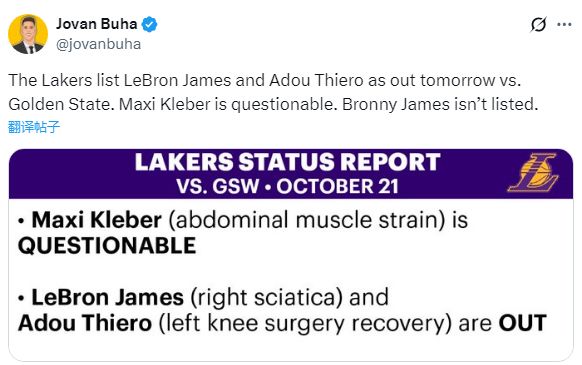 湖人官方公布揭幕战伤情报告——克莱伯(腹肌拉伤)出战成疑,50%出战可能性;詹姆斯(右侧坐骨神经痛)和阿杜-蒂耶罗(左膝手术恢复)都因伤缺席比赛;布朗尼不在伤病名单中,这意味着他的脚踝伤势已经无碍,可以回归赛场。