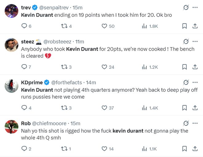 不少美国球迷对于杜兰特三节打卡十分不满,因为他们都希望杜兰特能拿到20+的数据,因为NBA陷入涉赌丑闻中,这些球迷都觉得杜兰特第四节被DNP有球场之外的因素。(但实际上火箭领先30+了没必要上杜兰特)