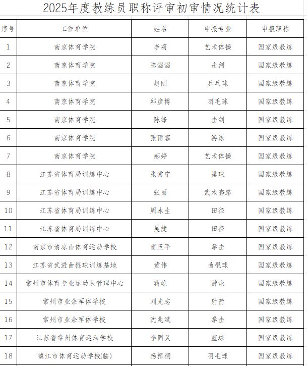 江苏省体育局人事处11月11日发布《2025年体育专业人员职称申报人员名单评前公示》。