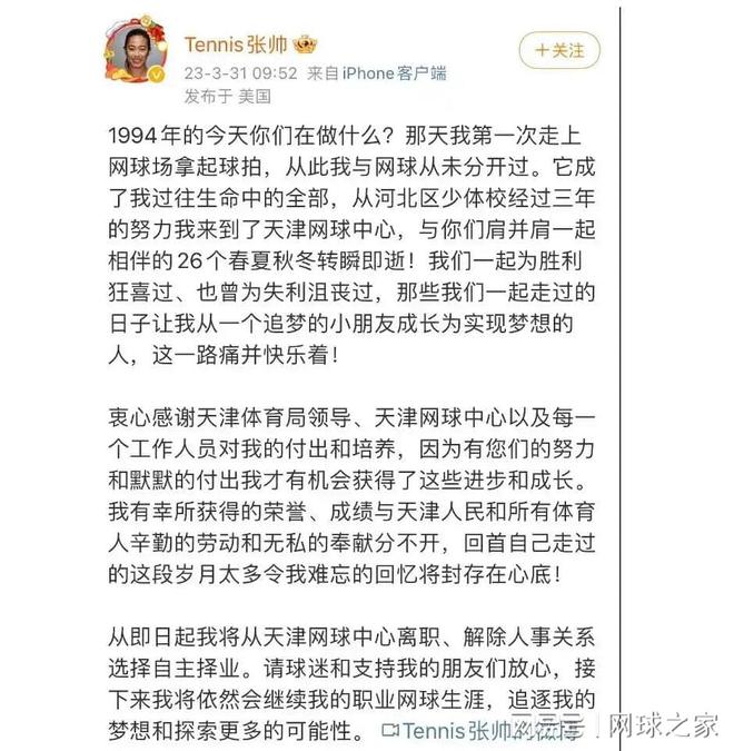随后的2021年全运会,张帅果断退出,在随后的2023年,张帅更是在国外发布了一则离职证明,宣布从天津网协解除一切人事关系,彻底转为职业选手。当时,张帅的字里行间还无不透露着对天津网球中心的感谢之情,“衷心感谢天津体育局领导、天津网球中心,以及每一个工作人员对我的付出和培养,因为有您们的努力和默默的付出,我才有机会获得了这些进步和成长。”