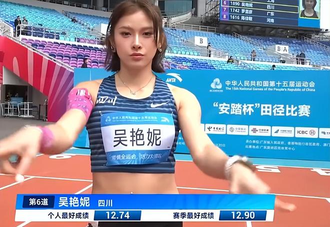 吴艳妮这一枪跑得很稳健,并没有完全发力,但还是稳稳地领先,最终跑出了12秒98的成绩,位列小组第一,并且是预赛总成绩第一。