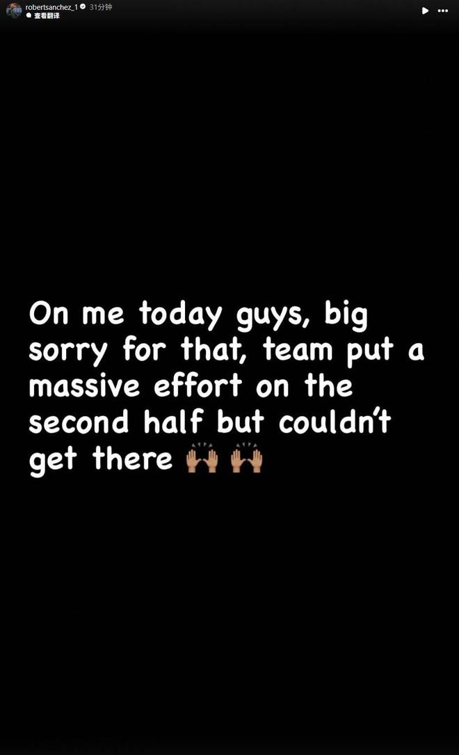 罗伯特-桑切斯写道:“今天的结果是我的错,非常非常抱歉,球队在下半场付出了巨大的努力,但最终没有取得想要的结果。”