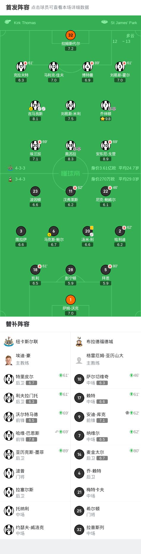 第75分钟,吉马良斯横传,乔林顿接球低射破门梅开二度,纽卡3-0!