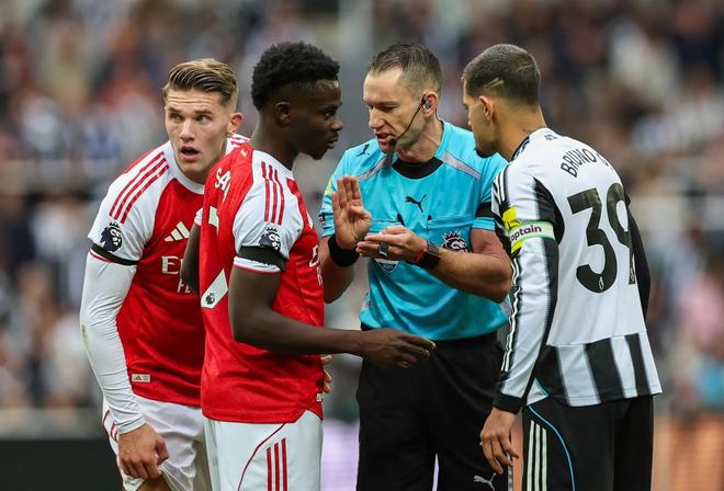 英超联赛第6轮,阿森纳2-1战胜纽卡斯尔的比赛是由贾里德-吉列执法的,他在比赛中先判给阿森纳一粒点球,在观看VAR后又取消判罚。他向萨卡解释这一判罚时,由于麦克风出问题,他说的话