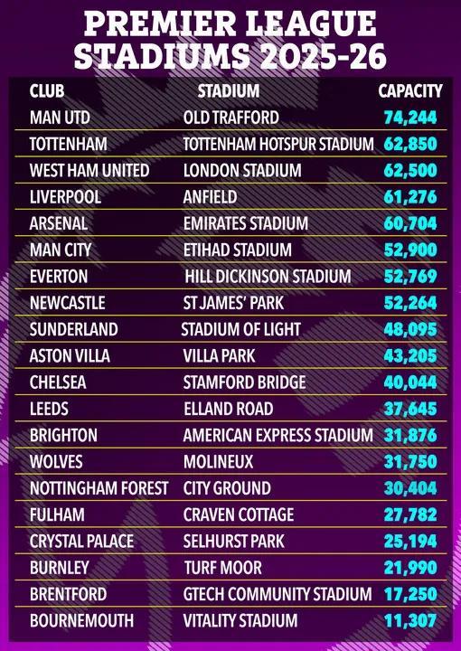 据《太阳报》消息,新赛季曼联等5队球场容量变大,切尔西则减少129座。