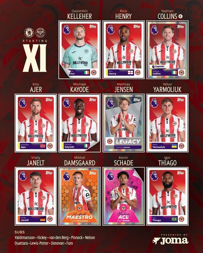 布伦特福德首发:1-凯莱赫、33-卡约德、22-内森-科林斯、3-里科-亨利、20-阿耶、18-亚尔莫柳克、24-达姆斯高、27-雅内尔特、8-延森、9-伊戈尔-蒂亚戈、7-沙德