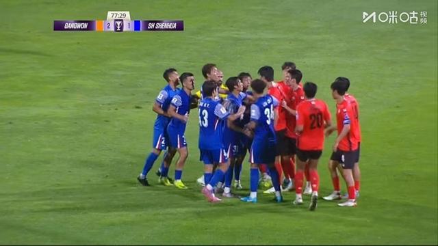 直播吧09月16日宣 亚冠精英联赛东亚区第1轮,上海申花客场对阵江原FC,比赛第79分钟,两队爆发冲突,于汉超铲球与对手发生冲突,随后裁判出示黄牌。