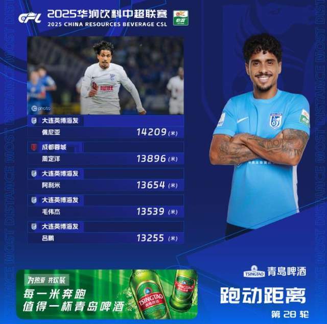 破纪录!大连英博外援单场跑动超1.4万米:中超近4年第一人